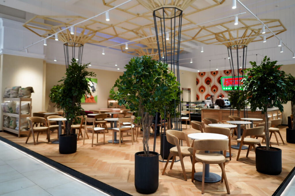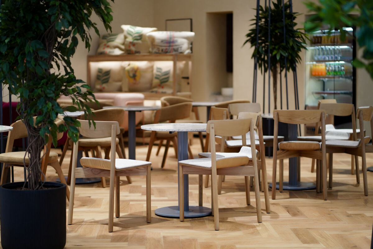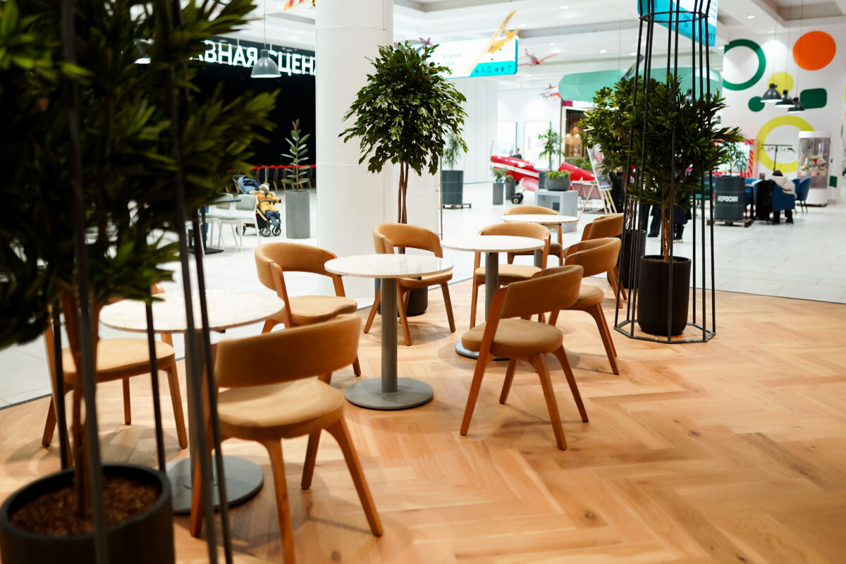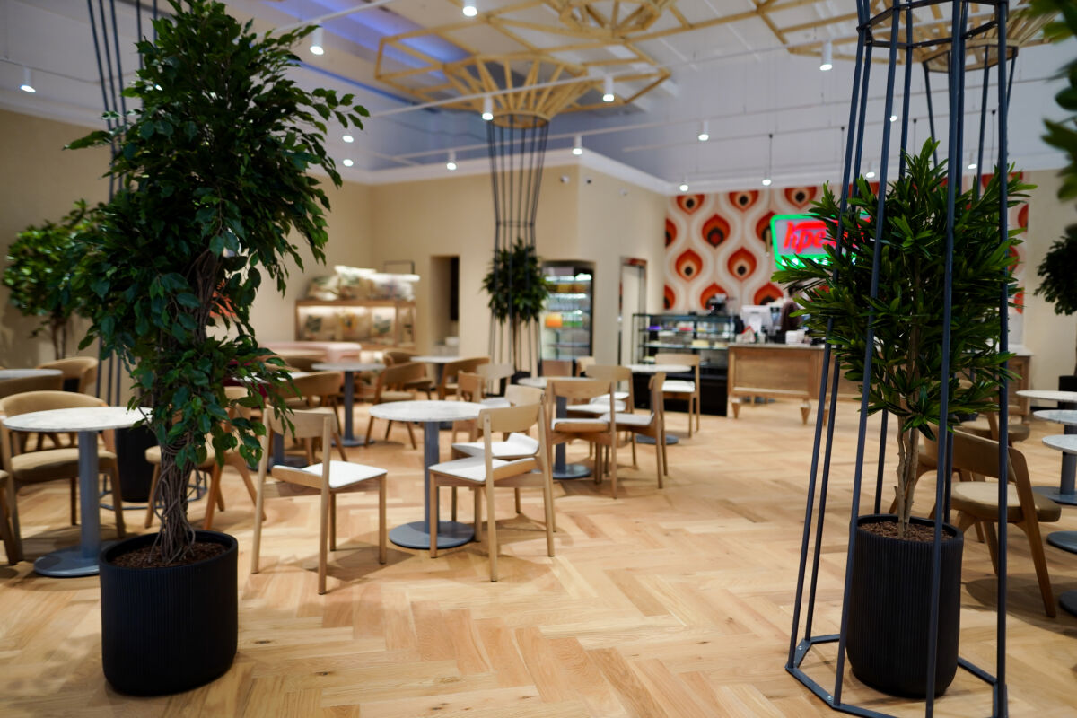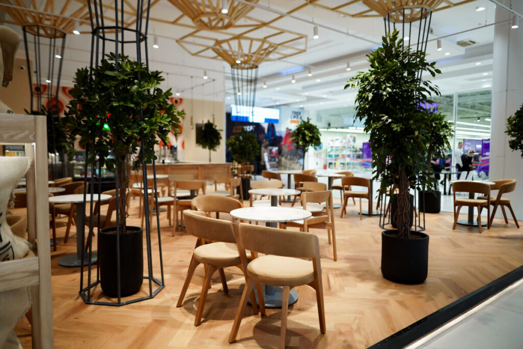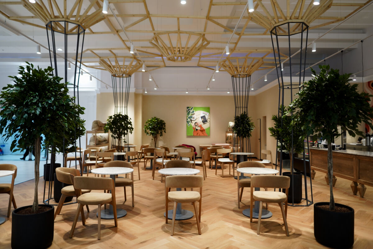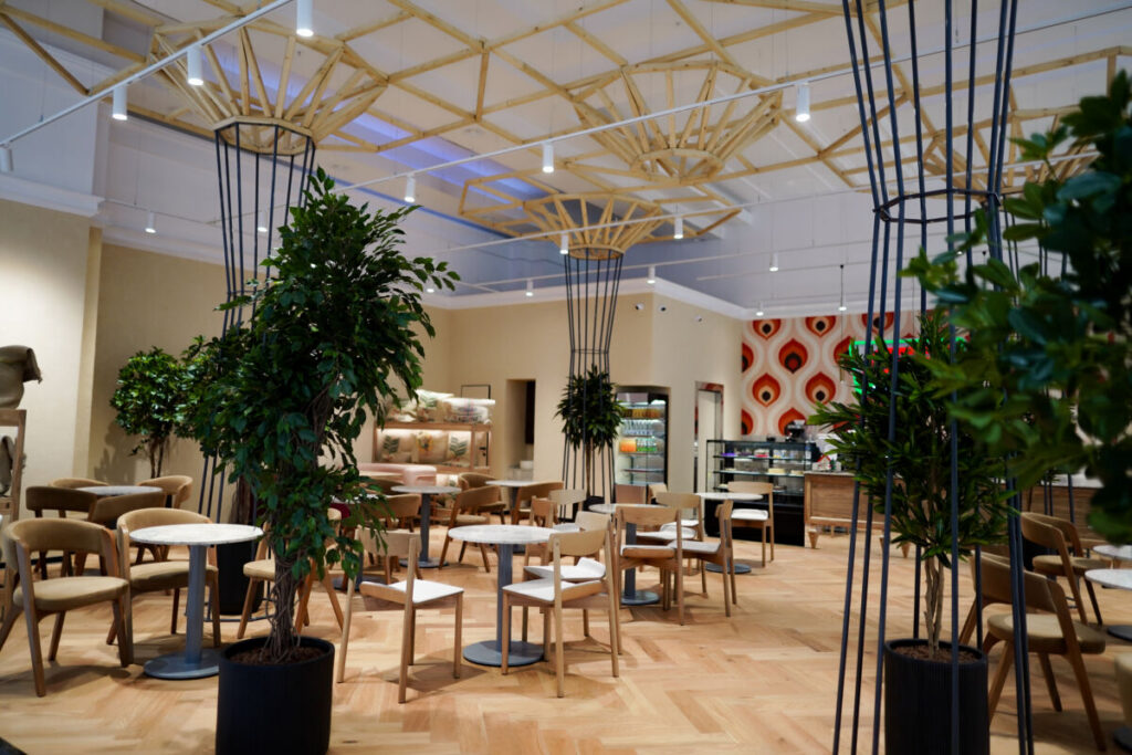 Интерьер заведения выполнен в теплых тонах натурального дерева и дополнен живой зеленью. Такая эстетичная обстановка позволяет гостям мгновенно переключиться от суеты — на волну спокойствия.