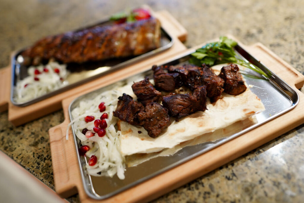В меню представлены сочные стейки, люля-кебаб, шашлык из нескольких видов мяса, а также рыба и овощи на углях.